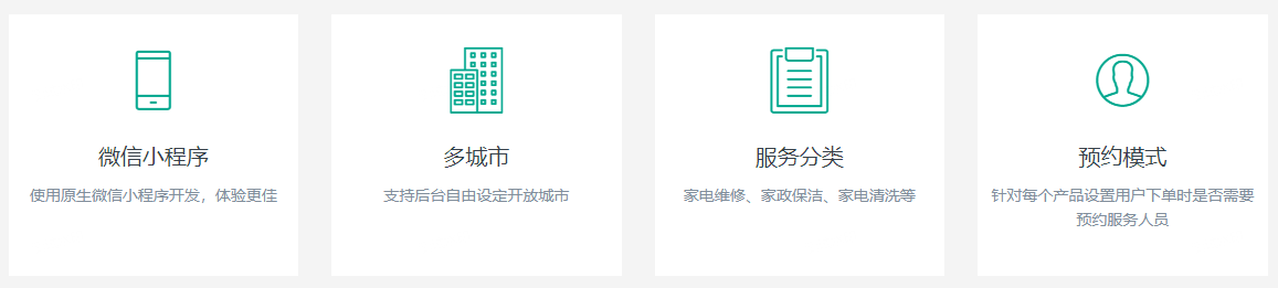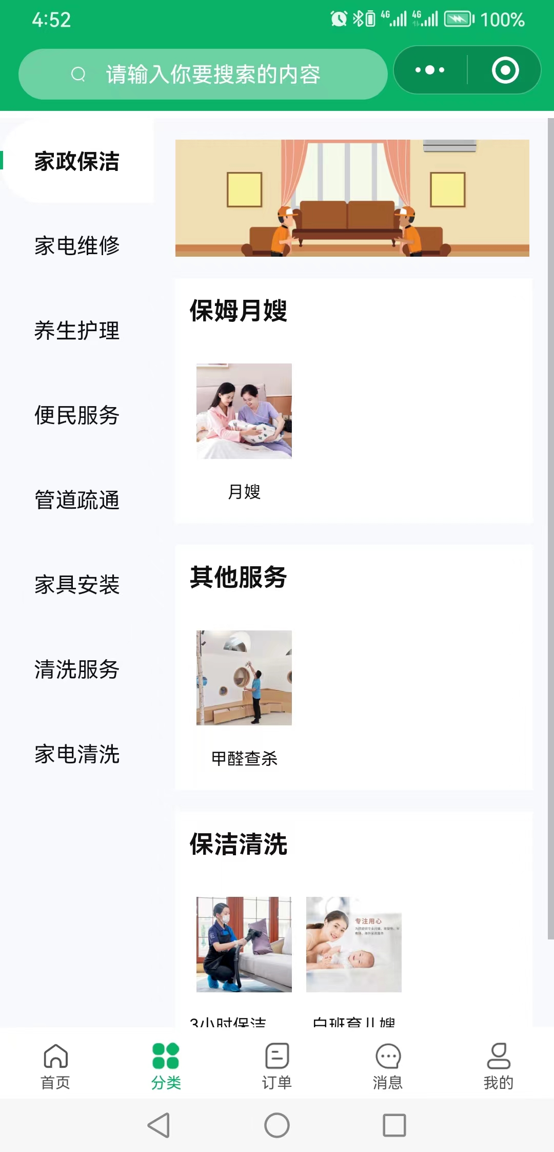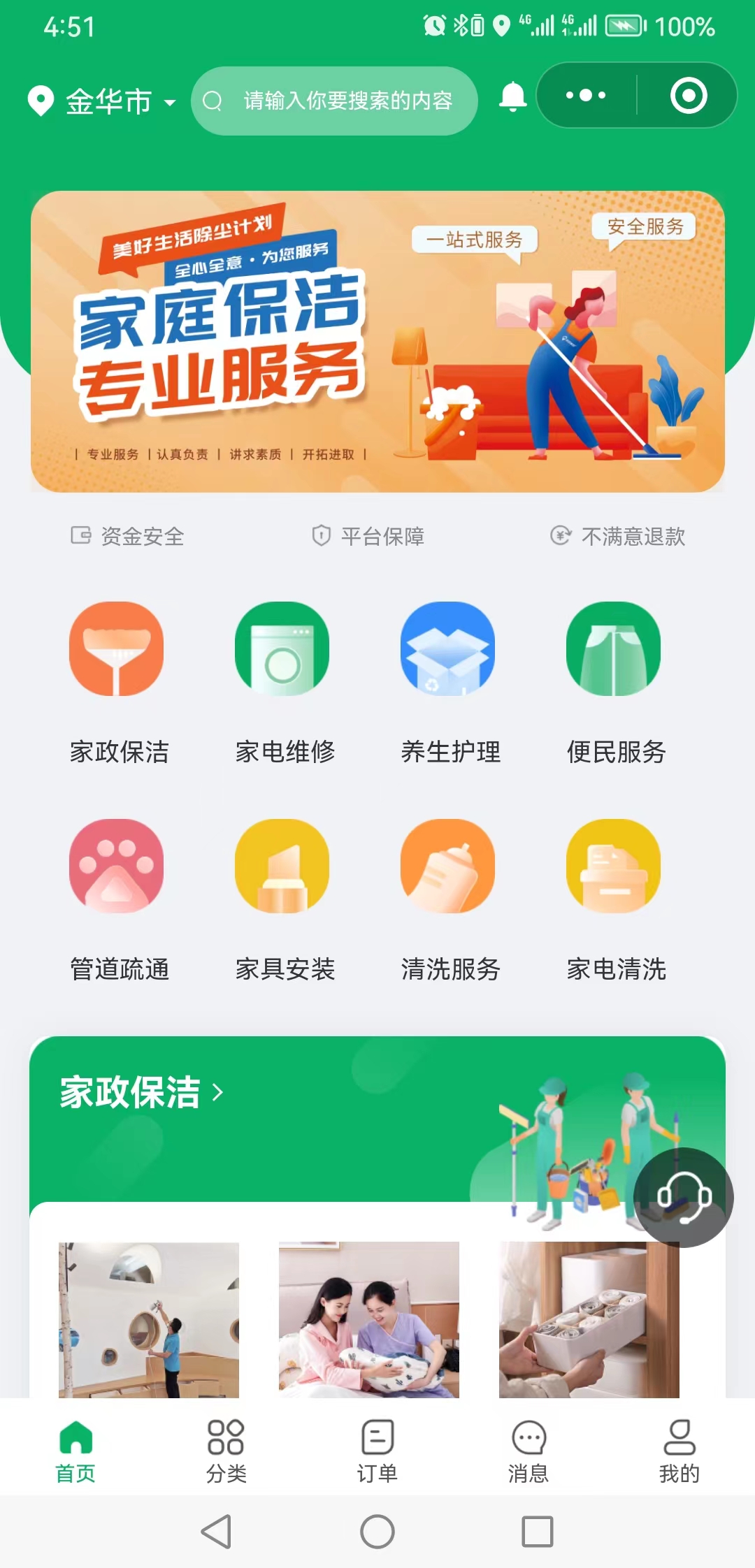 家政服務(wù)小程序系統(tǒng),包含家政保潔、家電維修、養(yǎng)生護(hù)理等服務(wù)內(nèi)容,支持線上下單、員工排班、技能認(rèn)證、錢包管理等。
