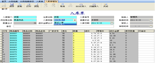 2.產(chǎn)品入庫(kù):可以通過EXCEL模版導(dǎo)入:接收廠家數(shù)據(jù);亦可根據(jù)貨號(hào)手動(dòng)錄入或者掃描槍掃描入庫(kù)。