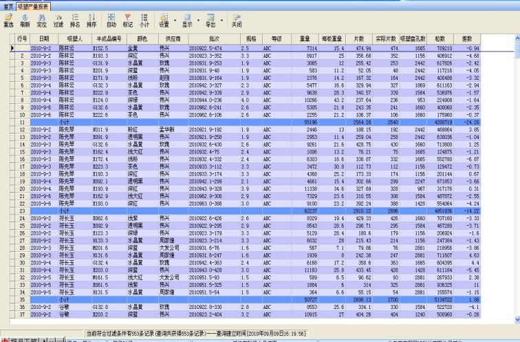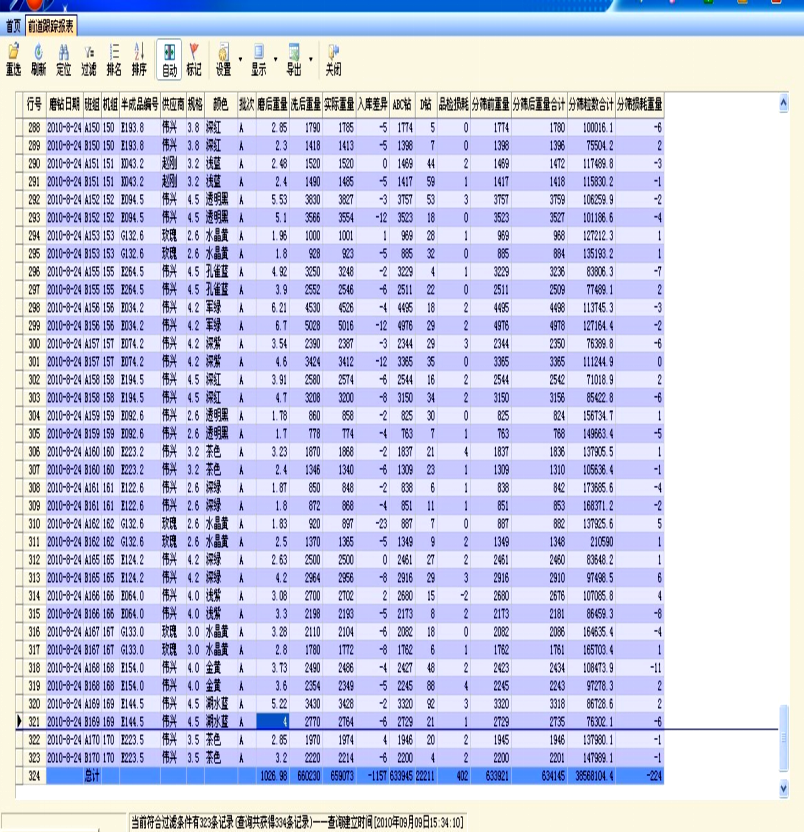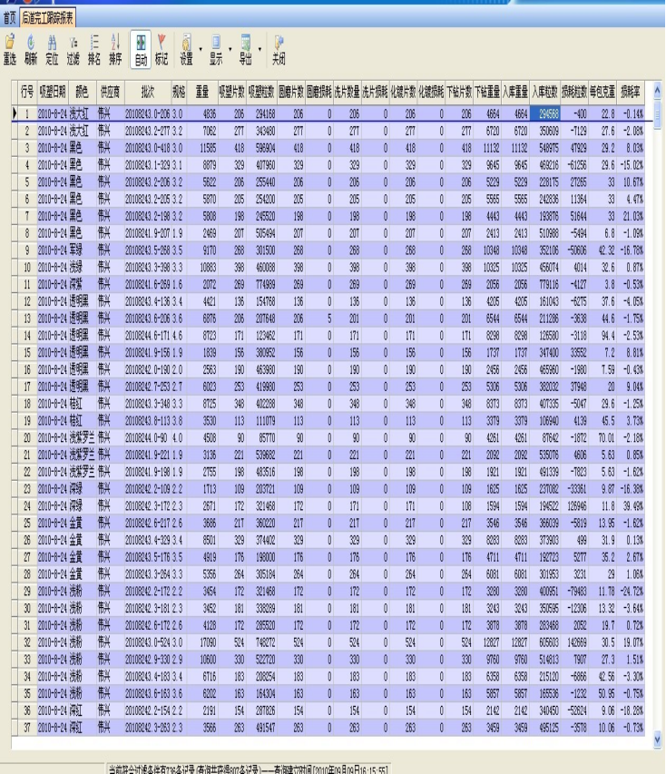 加強(qiáng)后道數(shù)據(jù)跟蹤,監(jiān)控從吸塑領(lǐng)料、吸塑、圓磨、洗片、掛片、化鍍、下鉆、入庫(kù)全過(guò)程,按吸塑批次核算水鉆生產(chǎn)過(guò)程中每道工序的實(shí)際損耗,統(tǒng)計(jì)從后道生產(chǎn)過(guò)程中的總損耗,實(shí)時(shí)監(jiān)控生產(chǎn)全過(guò)程;