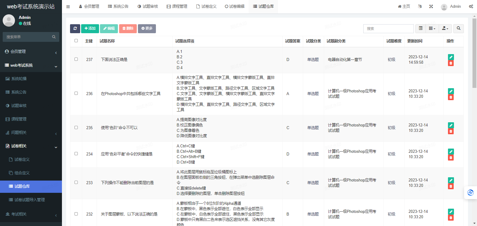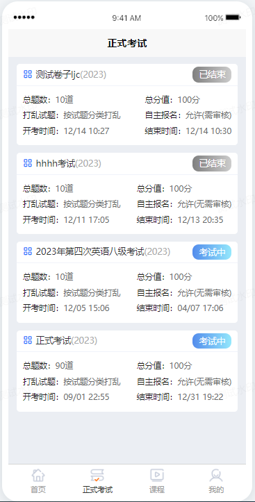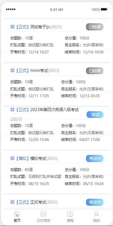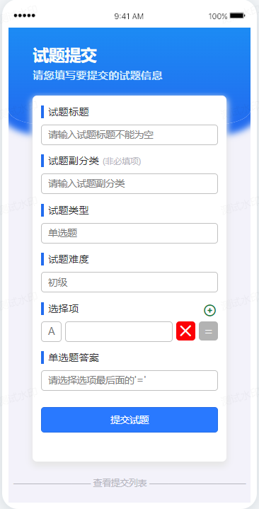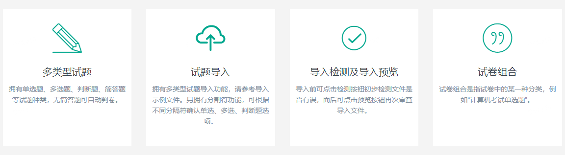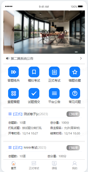 Web線上考試系統(tǒng),是一款H5手機(jī)端的考試系統(tǒng),支持試題批量導(dǎo)入,擁有單選題、多選題、判斷題、簡(jiǎn)答題等試題種類,支持線上課程、答題練兵、錯(cuò)題收集、模擬考試、自動(dòng)判卷。